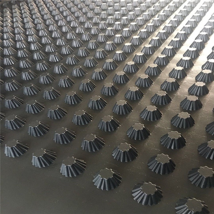 圓錐突臺的頂面膠接一層過濾土工布,以阻止泥土微粒通過,從而避免排水通道阻塞使孔道排水順暢。 傳統(tǒng)的排水方式使用磚石瓦塊作為導濾層、使用較多的鵝卵石或碎石作為濾水層、將水排到指定地點。而用排水板取代鵝卵石濾水層來排水則省時、省力又節(jié)能、節(jié)省投資、還能降低建筑物的荷載。